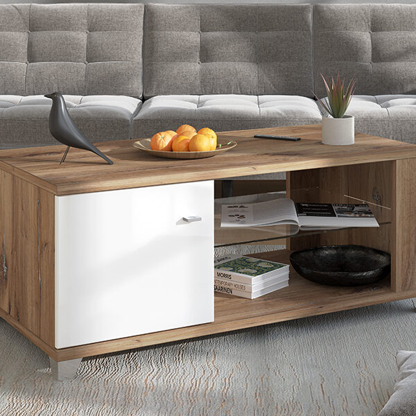 Klub sto BERT, u dekoru betona sa bijelom lak folijom, poseduje praktične i estetske efektne staklene police ispod radne površine pogodne za odlaganje omiljenih knjiga ili časopisa. Klub sto BERT doprinosi savremenom tematskom konceptu uređenja dnevnog boravka.