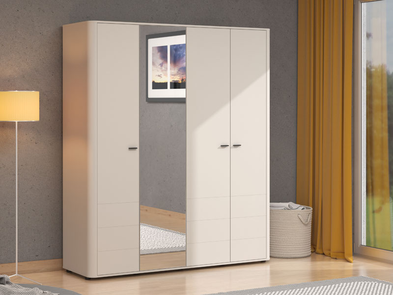 Ormar SERDICA 4K1O h211 u kombinaciji kašmir dekor i kašmir mat folije, predstavlja atraktivno i funkcionalno dizajnersko rešenje za opremanje savremenog ambijenta spavaće sobe. Ovaj četvorokrilni ormar , sa dva ogledala u centralnom delu, doprinosi izraženoj estetici, eleganciji, ali i praktičnosti ambijenta spavaće sobe. Upotrebni prostor ovog modela čine garderobne šipke, pregrade i dve fioke. Dio je istoimenog sistema elemenata za opremanje spavaće sobe SERDICA, modernog dizajna, zaobljenih ivica na elementima i visokim nogarima koji doprinose atraktivnosti savremeno dizajniranog enterijera.