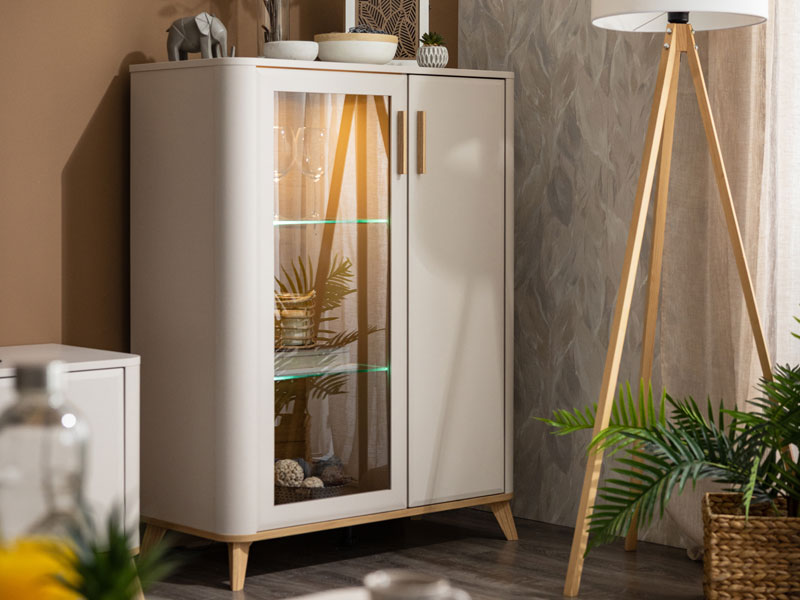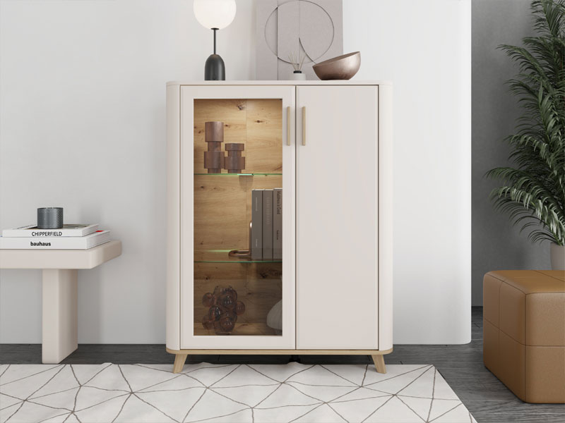 Vitrina DARWEN 2K VS1 117 u kombinaciji kašmir dekora, dekora artisan hrasta i kašmir mat folije predstavlja atraktivno rešenje za sve ljubitelje modernog dizajna enterijera. Idealan je izbor za uređenje dnevnog boravka. Upotrebni prostor čine jedan zatvoren dio i drugi zastakljeni dio, koji u unutrašnjosti poseduju praktično raspoređene police za odlaganje. Dio je sistema elemenata DARWEN za opremanje dnevne sobe koji zaobljenim ivicama na elementima i visokim nogari doprinose atraktivnosti savremeno dizajniranog enterijera. Poseduje mogućnost dodavanja rasvete, što je izuzetan način da se istakne njena estetika, a životni prostor učini još atraktivnijim.